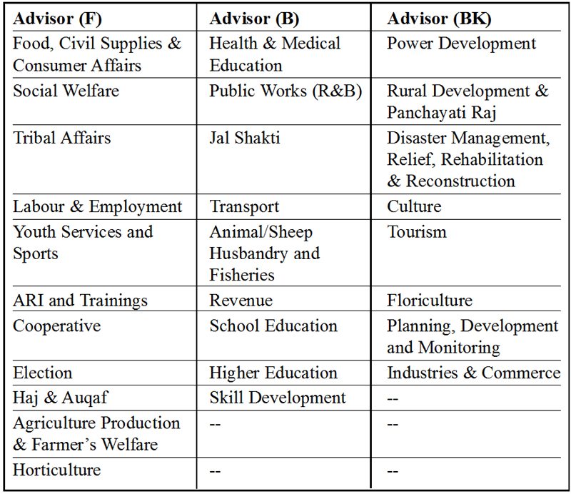 All the new Departments which have been allocated among Farooq Khan, Rajiv Rai Bhatnagar and Baseer Ahmad Khan were held by the outgoing Advisor KK Sharma.