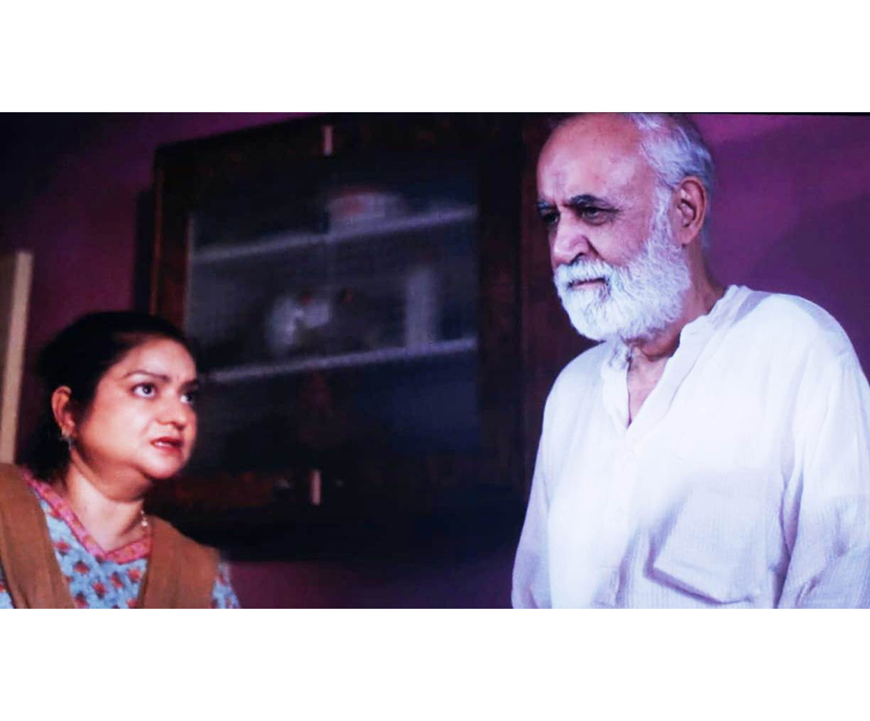 Veteran actor M.K.Raina and Kusum Tickoo in a scene from the film ‘Batt Koch’ which premiered in Jammu on Wednesday.