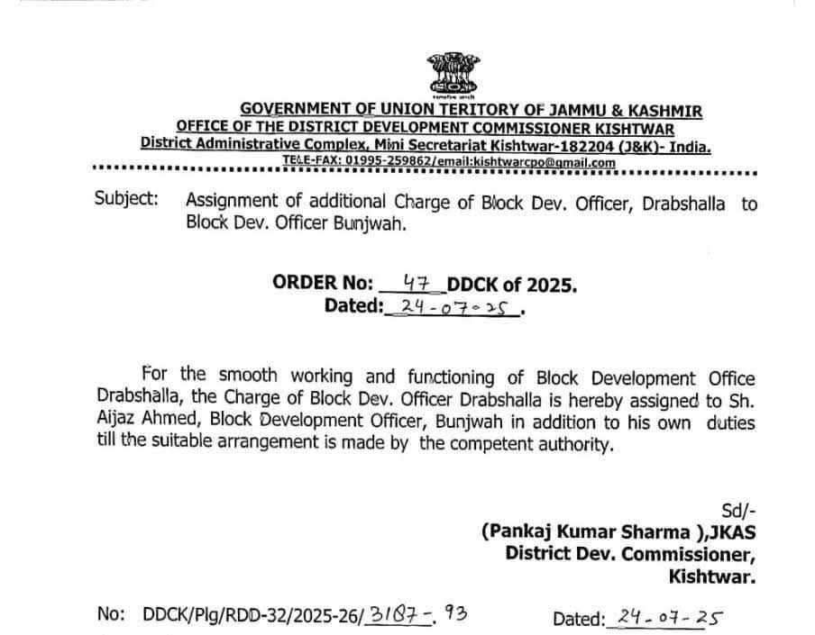 Kishtwar, Jul 24: For smooth functioning of the Block Development Office Drabshalla, Aijaz Ahmed, who is currently serving as the Block Development Officer Bunjwah, has been given the additional charge of Drabshalla block. The order was issued by the District Development Commissioner Kishtwar, Pankaj Kumar Sharma, and will remain in effect until further arrangements are made by the competent authority.