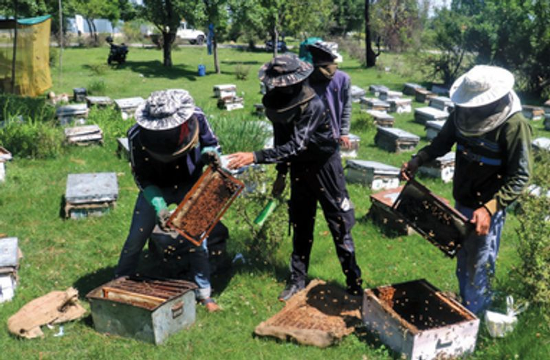 Beekeeping or apiculture significantly contributes to agriculture and exports with the Indian exports growing faster than production rates showcasing its profitability.Honey is recognised for its health-enhancing properties including boosting immunity and antibacterial effects.Honeybees are crucial for pollinating approximately 16 per cent of the world’s important flowering plants species,enhancing crop yields and quality significantly.Union territory of Jammu and Kashmir is said to be one of the most important and suitable beekeeping places in India.J&K is suitable for the stationary and migratory beekeeping because of its favourable climatic conditions and diverse natural sources. Beekeeping with Apis mellifera is popular in Jammu &Kashmir. Beekeepers undertake bees’ migration for honey production and there is an immense potential to improve honey production. Knowledge of floral resources and appropriate migration schedules in different beekeeping regions can increase the quality and quantity of honey. Researchers at the Central Bee Research and Training Institute, Pune studied the floral resources for A. mellifera and suggest various migration schedules for different phytogeographic regions in J&K and also in other parts of the country. Beekeeping has been practised since ancient times mainly for the precious honey stored by the bees in combs. It was practised in its simplest form in the forest areas. The indigenous oriental honey bee, Apis cerana, was kept in wall niches, clay pots or other receptacles by the beekeepers. With the introduction of scientific beekeeping, now the bees are kept in wooden boxes.