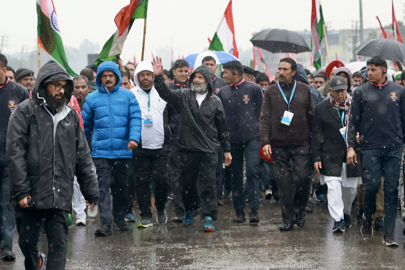 KATHUA, Jan 20: Braving winter rains, Congress leader Rahul Gandhi resumed his Bharat Jodo Yatra from Hatli Morh in the border district of Kathua today with several prominent leaders, including Shiv Sena stalwart Sanjay Raut, who also joined foot march.