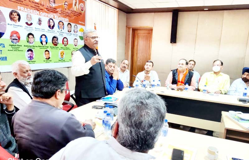 The meeting was attended by Arun Choudhary, patron; Ishar Das, general secretary organization; Tejinder Vohra, senior vice president; Ankur Gupta, Sudahkar Dwideei, S. Tejwant Singh and Arun Kumar Gupta-all vice presidents; Bimal Dev Singh, general secretary; Mohan Lal Sharma, secretary; Sanjay Poddar, secretary; Munish Gupta, treasurer; Prem Bhagat, joint secretary; S. Birwant Singh, president Kashmir; Meena Datta, president Mahila Morcha; Arti Jamwal, president Mahila Morcha Jammu district and working committee members like Swarna Devi, Narindera Devi, Arti Devi, Krishan Lal from Ramban, Phulel Singh from Ramban, Swami Raj Meghwan from Doda, Swarn Veer Singh from Doda, Ashwani Kaw, Rakesh Badyal and Ajay Gupta.