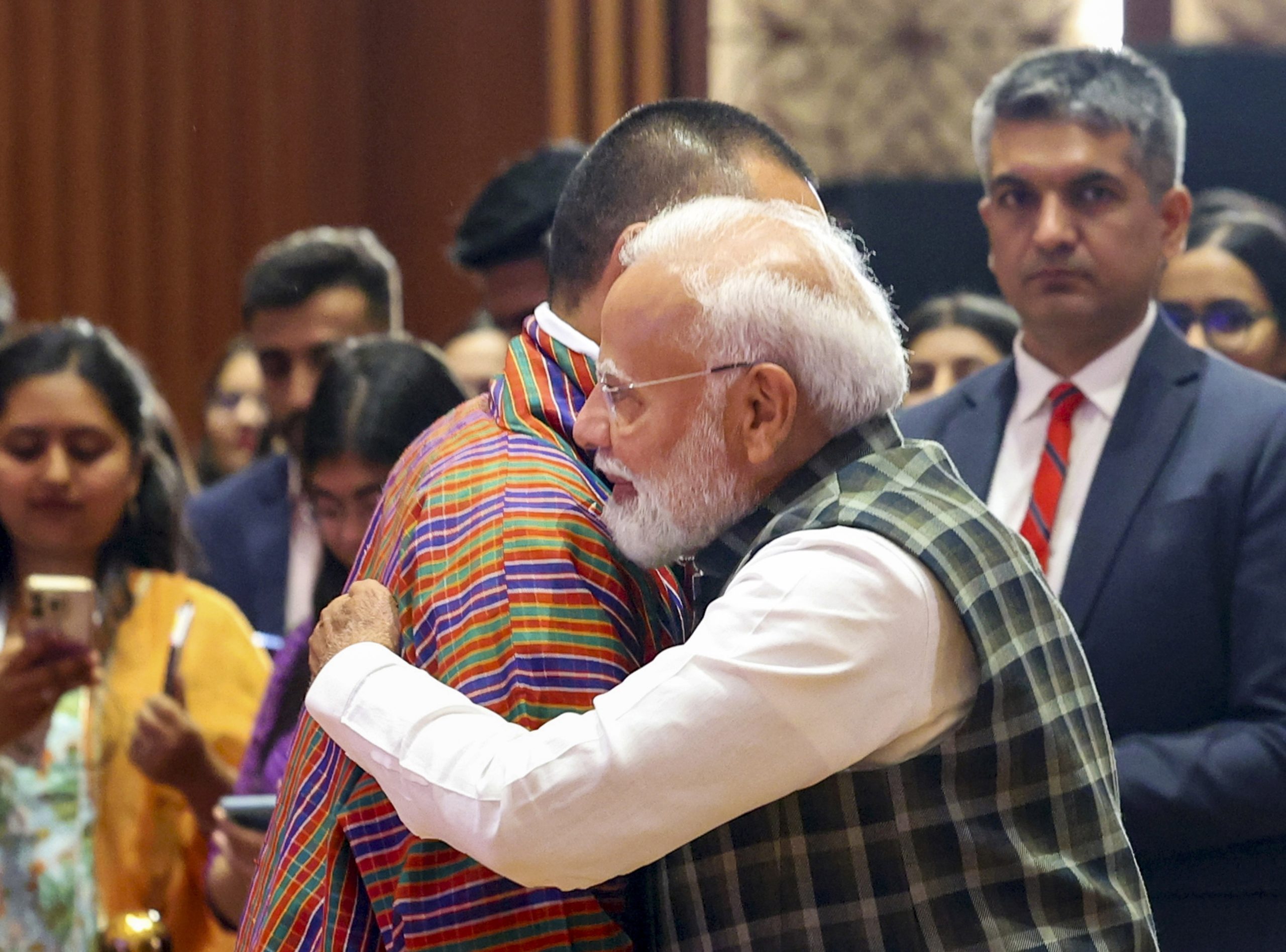 “The greatest leaders in history have not merely led organisations or nations, they have led revolutions of thoughts, process and development. ‘Aadarniya Pradhan Mantri, mere bade bhai, aapne apni buddhimani, saahas aur karuna se bhare netritav se Bharat ko das hi warshon mein pragati ke path par agrasar kiya hai’ (Hon’ble Prime Minister, my elder brother, with your leadership driven with intelligence, courage and compassion, you have set India on the path of development in just 10 years,” Tobgay said.