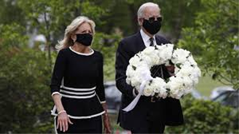 Biden and his wife, Jill, laid a wreath of white flowers tied with a white bow, and bowed their heads in silence at the park. He saluted.