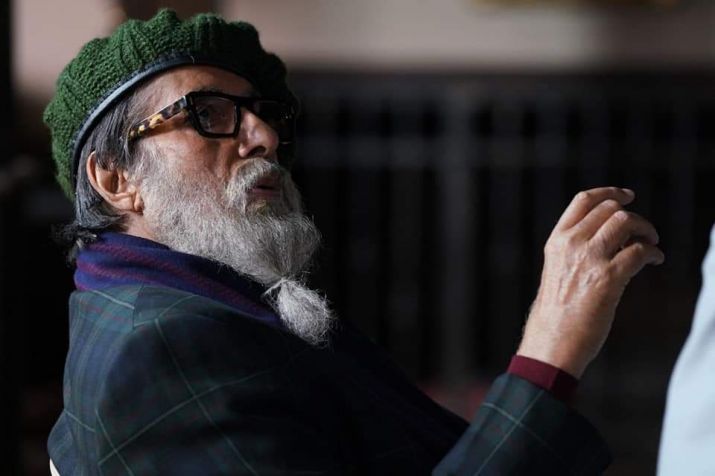 The first look shows Amitabh Bachchan wearing a green pantsuit and a muffler around his neck. He tied his long beard and completed his look by sporting a green beanie and spectacles.