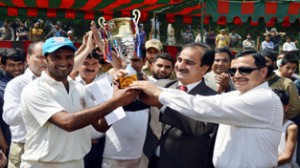 Commander Sector 1 Brig Deepak Benergy and Deputy Commissioner Anantnag Farooq Ahmad Lone giving winner trophy to Bijbehara sports club on Sunday.