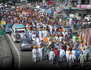 Yuva Rajput Sabha members taking out Shobha Yatra in Jammu on Wednesday.  —Excelsior/Rakesh