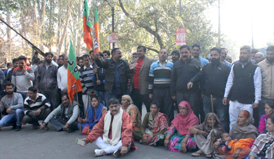 JAMMU, Dec 19: Activists of Bharatiya Janata Party (BJP) today staged a massive demonstration at Muthi and blocked Akhnoor road for three hours in protest against the Tehsildar North, Jammu and Patwari Halka, Damana who were demanding Rs 15 lakh from a farmer belonging to SC community for transfer of 28 kanals of his ancestral land on his name.