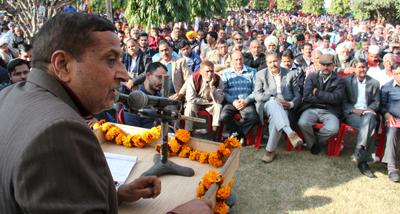Senior PCC leader Sham Lal addressing workers’ meeting at Akhnoor on Sunday.
