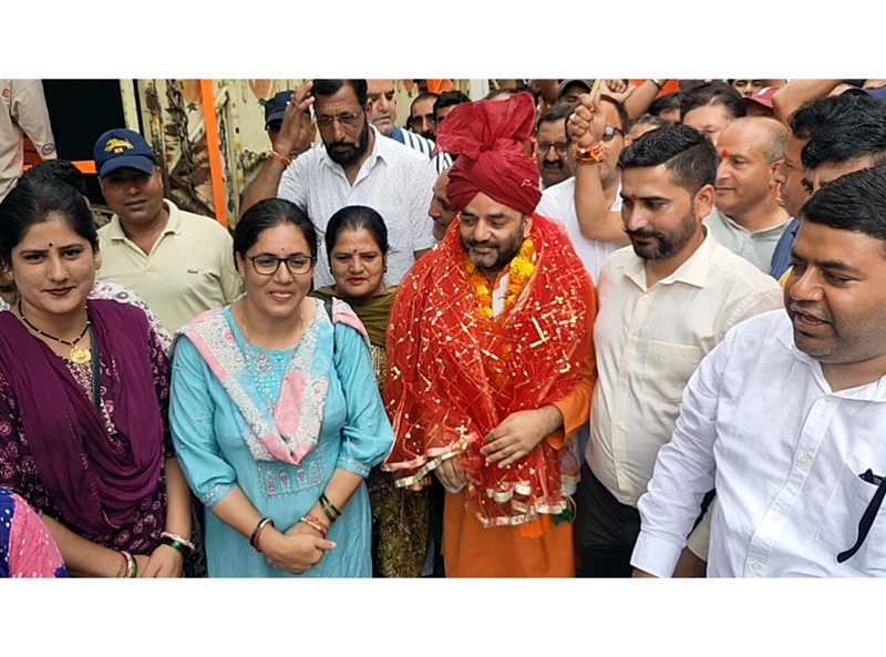BJP candidate Rakesh Singh on way to file papers for Ramban seat on Tuesday. — Excelsior/Pervaiz