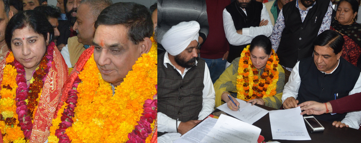 BJP candidates Chander Mohan Gupta and Purnima Sharma (Left) filing nomination papers for post of Mayor and Deputy Mayor respectively while Congress candidate (Right) Charanjeet Kour Shingari filling nomination papers for post of Deputy Mayor at Jammu on Saturday. —Excelsior/Rakesh