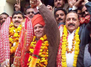 Jugal and Khajuria were garlanded, offered bouquets and later a procession was taken out to the party headquarters.