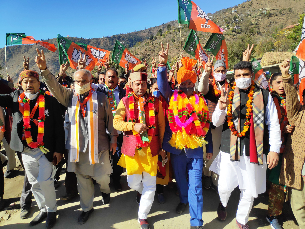 BJP general secretary (Org) Ashok Kaul and party vice president, Pawan Khajuria during election rally in Ramban area on Friday.