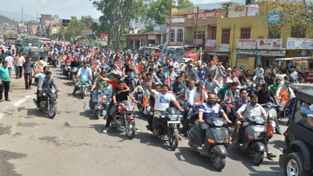 Earlier Jugal Kishore Sharma was taken in a huge motor cycle and car rally from Dak Bungalow, which passed through the main bazars of the city to D.N. Palace, where a largely attended public rally was held in his honour.