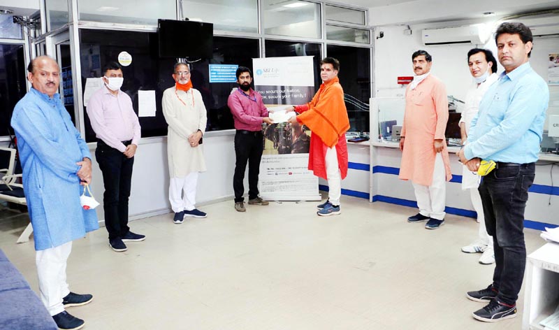 BJP J&K president Ravinder Raina presenting bank cheques to the Manager, State Bank of India at Trikuta Nagar Branch, Jammu.