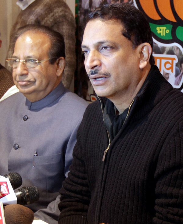 BJP leader Rajeev Partap Rudy along with Jagdish Mukhi and newly elected BJP president Jugal Kishore Sharma talking to reporters at Jammu on Saturday.