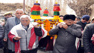 BJP leaders including Deputy Chief Minister, Dr Nirmal Singh shouldering the body of CEC, LAHDC, Leh Dr Sonam Dawa for performing last rites on Tuesday. —Excelsior/Morup Stanzin