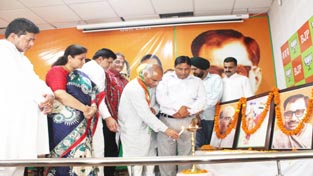 BJP leaders lighting the lamp during the Foundation Day celebration at party office Trikuta Nagar on Friday.     -Excelsior/Rakesh
