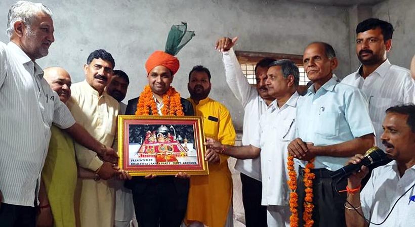 BJP leaders presenting a memento to first IAS officer from Akhnoor, Ankush Bhagat on Thursday.` By Daily Excelsior - April 25, 2019 Share FacebookTwitterWhatsAppPinterestLinkedinCopy URLTelegramEmailTumblrReddItPrintKoo BJP leaders presenting a memento to first IAS officer from Akhnoor, Ankush Bhagat on Thursday. Follow our WhatsApp channel