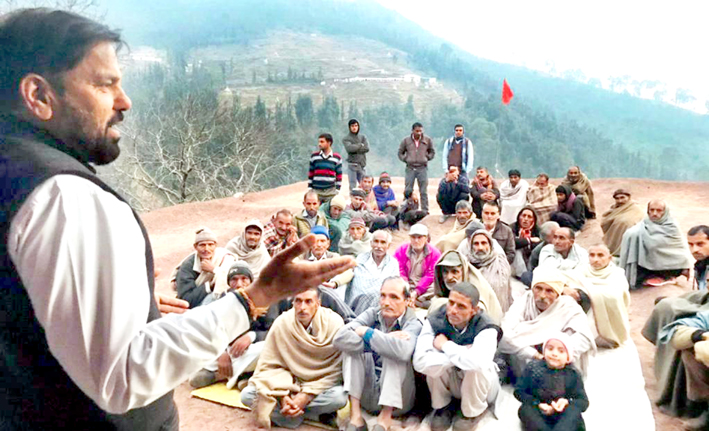 NPP leader Harshdev Singh addressing public meeting in Ramnagar on Monday.