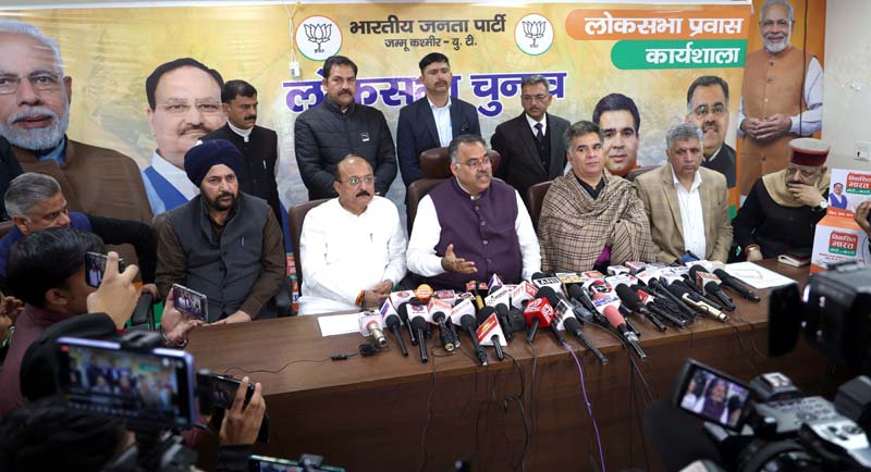 BJP, national general secretary, Tarun Chugh flanked by senior party leaders addressing a press conference at Jammu on Tuesday. -Excelsior/Rakesh