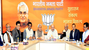 BJP National President Amit Shah chairing a high level party meeting to discuss issues related to Northeast at party headquarters at New Delhi. Also seen in picture are Ram Lal, Ram Madhav, Dr Jitendra Singh, Sarbananda Sonowal and Kiren Rijiju.