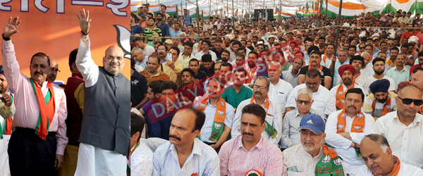 BJP national president Amit Shah waving to huge gathering at a rally in Jammu on Saturday. -Excelsior/Rakesh