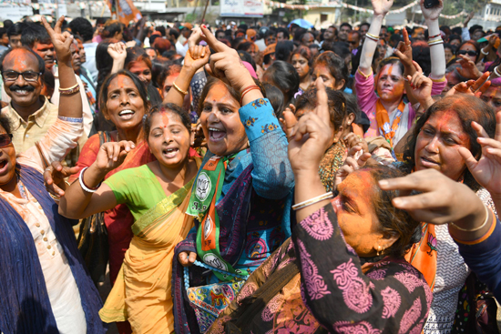 BJP supporters celebrating the party’s victory in Tripura Legislative Assembly election, in Agartala on Saturday. (UNI)