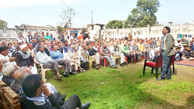 Senior Cong leader Dr Manohar Lal addressing workers at Billawar.