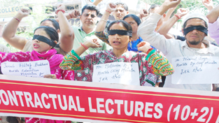 Blind folded Contractual Lecturers protesting against Govt on Thursday. By Daily Excelsior - May 5, 2017 Share FacebookTwitterWhatsAppPinterestLinkedinCopy URLTelegramEmailTumblrReddItPrintKoo Blind folded Contractual Lecturers protesting against Govt on Thursday. Blind folded Contractual Lecturers protesting against Govt on Thursday. Follow our WhatsApp channel