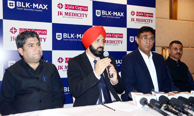Doctors from BLK-Max Super Speciality Hospital and Ujala Cygnus JK Medicity Hospital addressing media persons in Jammu. —Excelsior/Rakesh