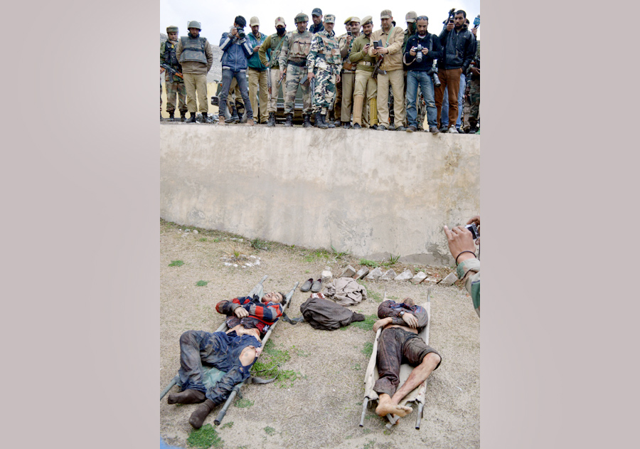 Bodies of two militants killed at Khrew in Pulwama on Sunday. —Excelsior/Amin War