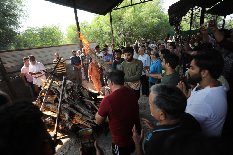 JAMMU, Oct 16: In a gloomy atmosphere, the body of Puran Krishan Bhat, who was gunned down by militants in Shopian area of Kashmir yesterday, was consigned to flames after his daughter Shriya, 12, and son Shanu, 11, jointly lit the funeral pyre at a crematorium in Bantalab area here this morning.