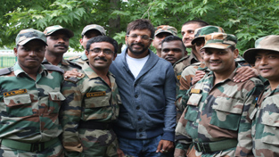 Bollywood actor Javed Jaffri poses for a photograph with soldiers during shooting for his upcoming Malayalam film in hopian district on Thursday. -Excelsior/Younis Khaliq