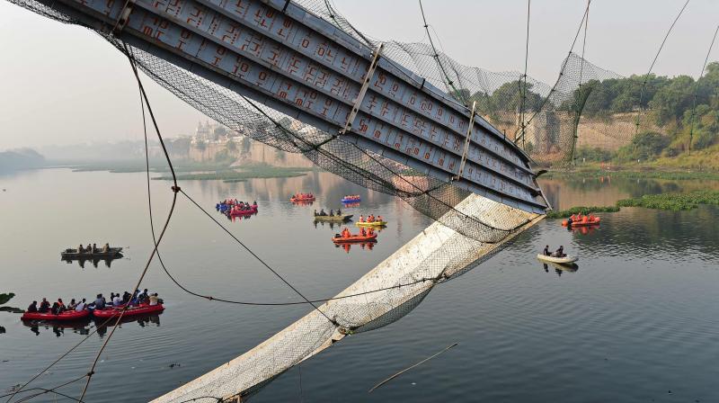 Sanghavi told reporters the State Government has formed a committee to conduct a probe into the bridge collapse. Police have registered an FIR (first information report) on charges of culpable homicide not amounting to murder and attempt to commit culpable homicide against agencies given the task of maintenance and operation of the bridge. In the FIR lodged at the Morbi ‘B’ division police station on Sunday night, police have shown “agencies responsible for maintenance and management of the hanging bridge” as the main accused.