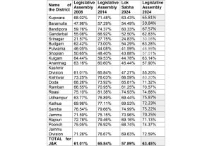 In Jammu district’s 11 segments, Bishnah (SC) recorded 74.00 per cent polling, Suchetgarh (SC) 71.00 per cent, R S Pura-Jammu South 65.00 per cent, Bahu 60.51 per cent, Jammu East 62.00 per cent, Nagrota 77.7 per cent, Jammu West 57.65 per cent, and Jammu North 72.00 per cent, Akhnoor (SC) 79.70 per cent, Marh (SC) 79.00 per cent and Chhamb 79.00 per cent.