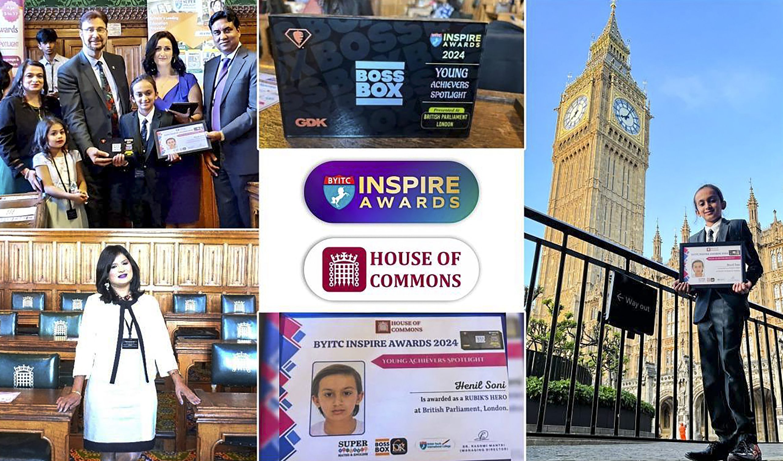 Henil Soni, 11, was recently awarded with an Inspire Award by the British Youth International College (BYITC) at an event in the UK Parliament complex for his mastery of the Rubik’s Cube as a “testament to his sharp intellect and unwavering determination”.