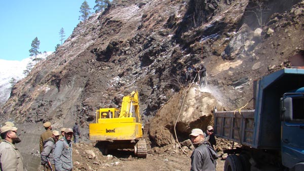 BRO machine clearing landslide near Gangroo in Ramsu area on Jammu-Srinagar National Highway on Friday. More pics on page 5&9. —Excelsior/Parvez