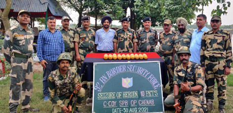 BSF officials posing with packets of heroin recovered from border area of Akhnoor in Jammu. By Daily Excelsior - August 31, 2021 Share FacebookTwitterWhatsAppPinterestLinkedinCopy URLTelegramEmailTumblrReddItPrintKoo BSF officials posing with packets of heroin recovered from border area of Akhnoor in Jammu. BSF officials posing with packets of heroin recovered from border area of Akhnoor in Jammu. Follow our WhatsApp channel