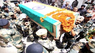 BSF soldiers carrying coffin of martyred jawan for wreath laying ceremony at BSF Paloura Headquarters on Friday.-Excelsior/Rakesh By Daily Excelsior - May 18, 2018 Share FacebookTwitterWhatsAppPinterestLinkedinCopy URLTelegramEmailTumblrReddItPrintKoo BSF soldiers carrying coffin of martyred jawan for wreath laying ceremony at BSF Paloura Headquarters on Friday.-Excelsior/Rakesh Follow our WhatsApp channel