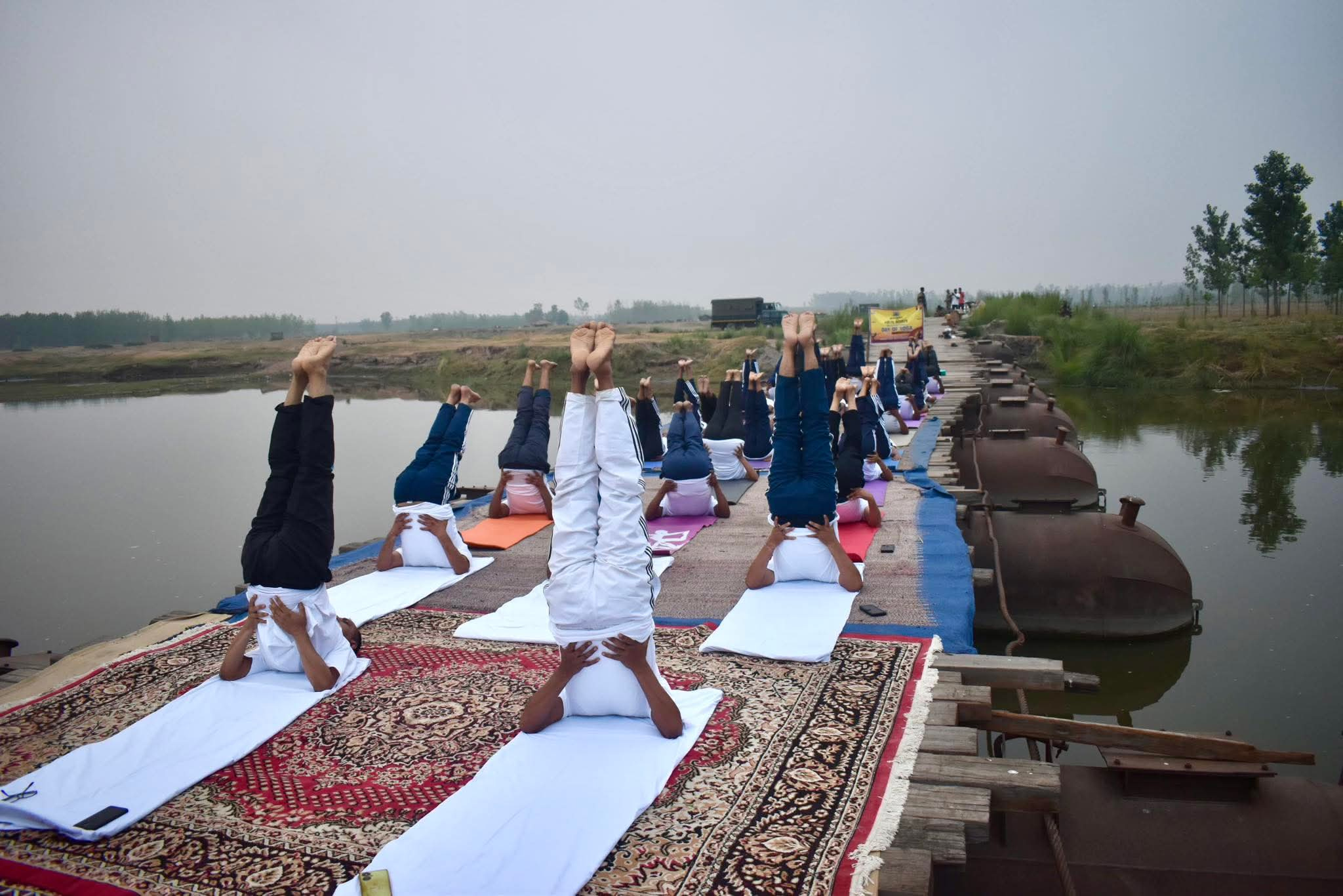 Scores of BSF troops from Madhopur practiced yoga on the pontoon bridge as a precursor to the International Yoga Day 2025, they said.