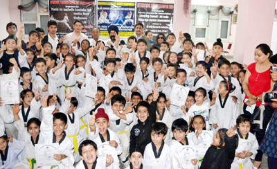 Budding Karatekas posing for a group photograph after qualifying the belt grading test on Sunday.