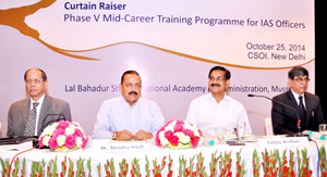 NEW DELHI, Oct 25: Addressing a group of senior IAS officers at the “Curtain Raiser” programme of the Mid-Career training at Lal Bahadur Shastri National Academy of Administration (LBSNAA), Mussoorie, Union Minister of State (Independent Charge) of Science & Technology and Earth Sciences, MoS PMO, Personnel, Public Grievances & Pensions, Atomic Energy and Space, Dr Jitendra Singh said here today said that Indian bureaucrats need constant re-orientation because they are faced with new challenges every day, the expectation level is high, the conditions across the country are heterogeneous and above all, they are expected to develop the skill of adjusting with every new political dispensation under which they work.