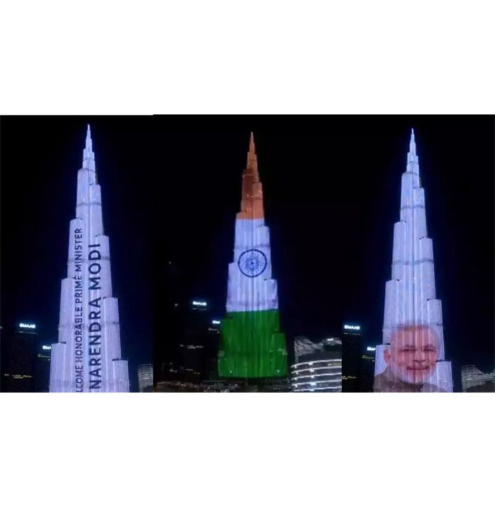 DUBAI, Feb 14 : The iconic Burj Khalifa was lit in the Indian tri-colour as Prime Minister Narendra Modi held talks with the UAE President and India was the guest of honour at this year’s World Governments Summit here.