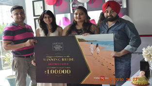 Business owner, Priya Sharma presenting cheque worth Rs one lakh to the winner of ‘Show Stopping Bride’ contest, Deepreet Kour at Lakme Salon, Trikuta Nagar in Jammu.