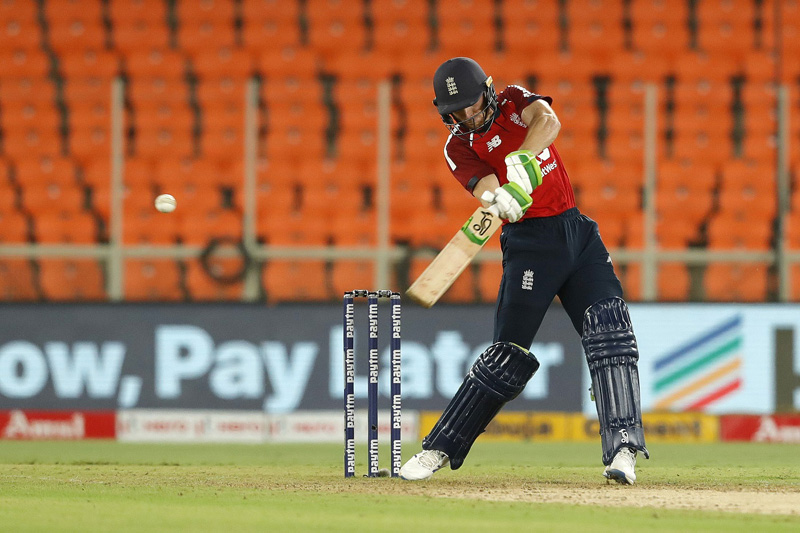 Jos Buttler playing a shot against India in 3rd T-20 match at Ahmedabad on Tuesday.