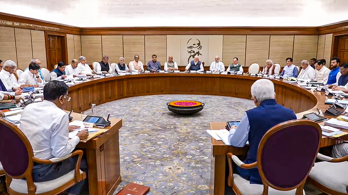 File Photo | In this screenshot from PMO website on May 7, 2025, Prime Minister Narendra Modi with Defence Minister Rajnath Singh, Union Home Minister Amit Shah, Union Ministers Nitin Gadkari, JP Nadda and others are seen during a Cabinet meeting.