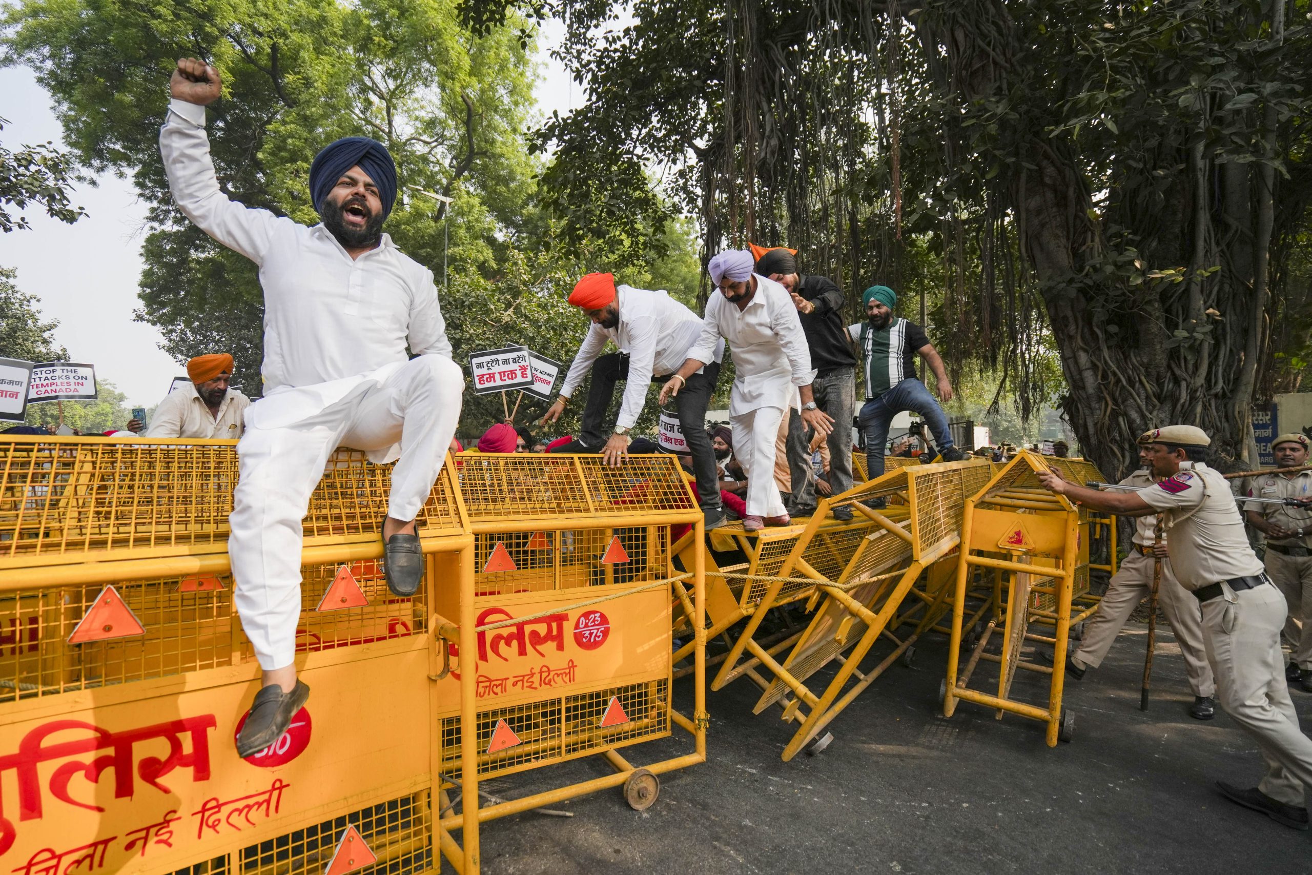Delhi Police was seen pleading the protestors to stay behind the barricades.