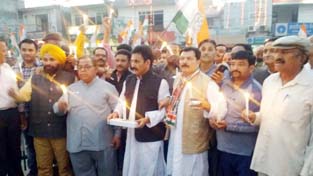 In Kathua town, former minister and senior PCC leader Dr Manohar Lal Sharma and DCC president Subhash Gupta (Ex-MLC) were leading the candle light procession. While speaking on occasion at Shahidi Chowk Kathua, Dr Sharma strongly condemned the dictatorial attitude of Modi Government to suppress the voice of public and opposed his anti people, anti- Sainik and anti- farmer approach.