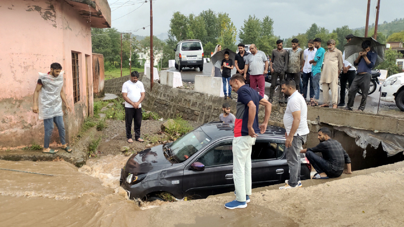 A car which washed away due to heavy rain in Mendhar area of Poonch on Sunday.